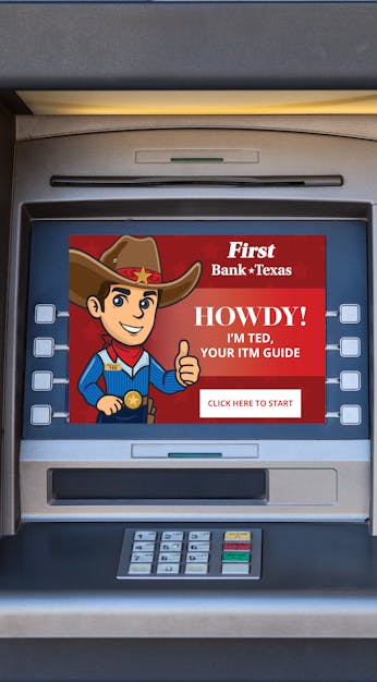 The ITM (Interactive Teller Machine) launch in 2024 welcomed Ted, the brand's unofficial mascot. Ted greets customers on screen to walk them through steps for using the ITM. From development of Ted to creation of ribbon cutting invitations, our creative agency supported the launch of this branded effort.
