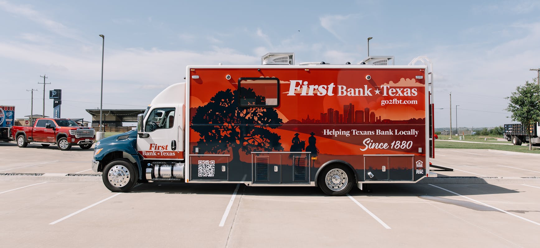 Bluebird Creative worked alongside the in-house marketing team at First Bank Texas providing initial wrap design for the branch all through branded collateral, PR efforts and launch materials for the new mobile branch.